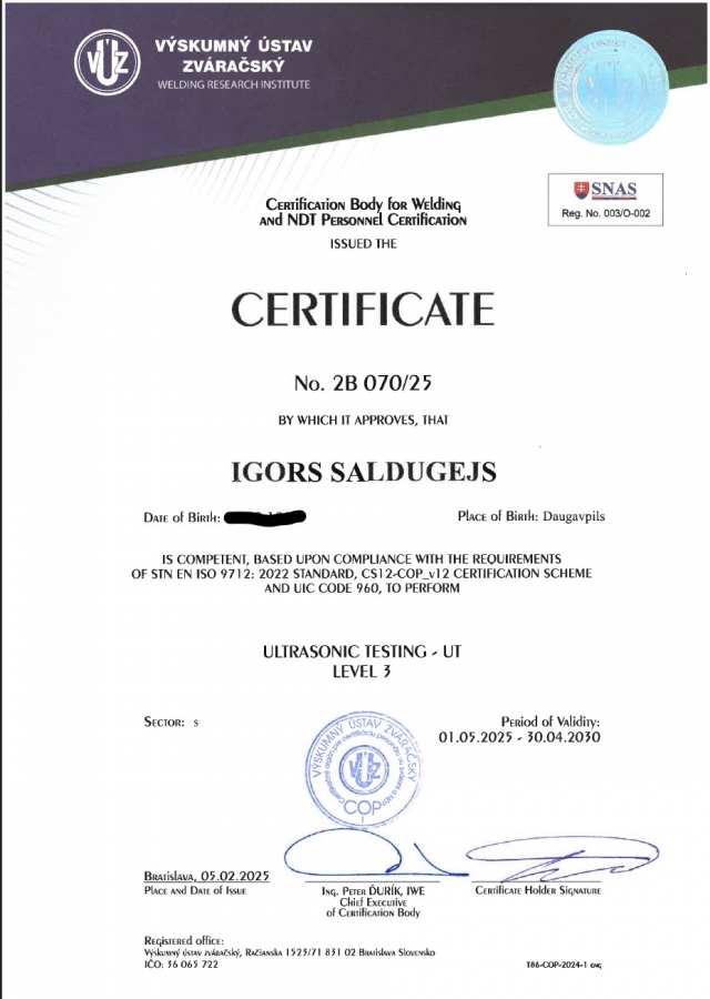 Starptautiskā sertifikācija: mūsu absolventi saņem Eiropas sertifikātus saskaņā ar ISO 9712 standartu, ko izsniedz Slovākijas Metināšanas institūts (VUZ).