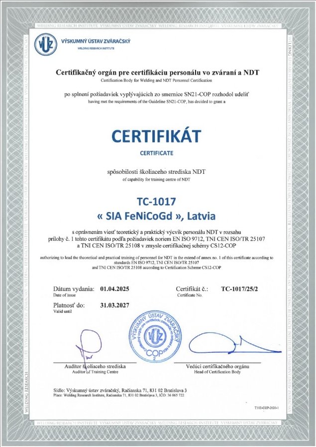 - Personnel Training and Certification: A recognized NDT training center approved by the Slovak "Welding research institute (VúZ)" for the preparation of NDT inspectors in accordance with ISO 9712.