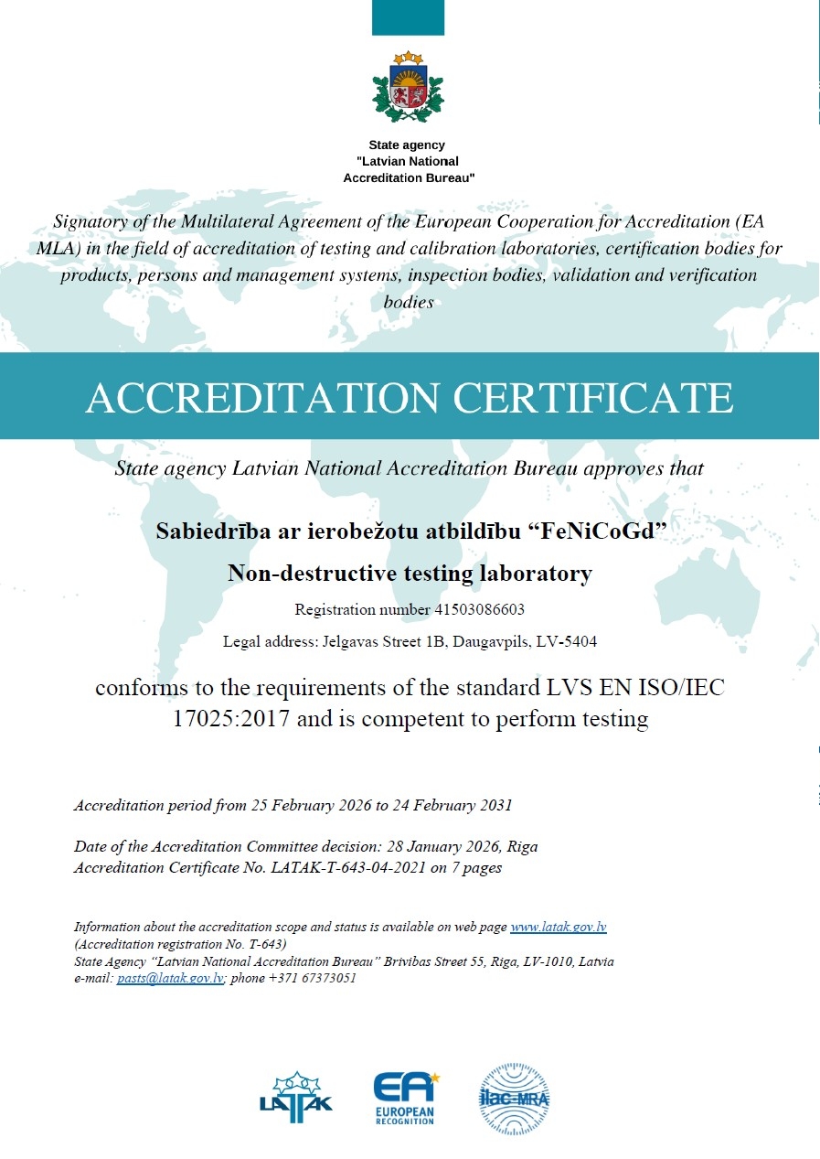 The enterprise complies with the requirements of the LVS EN ISO/IEC 17025:2017 standard (LATAK No. T-643). Scope of accreditation: non-destructive testing of technological and lifting equipment, metal structures, and fusion-welded joints of metals using visual, eddy current, ultrasonic, ultrasonic thickness measurement, capillary (penetrant), and magnetic particle methods. With our accreditation and the recognition of leading maritime registers (DNV, Lloyd’s Register), we ensure uncompromising quality and technical precision where safety is a critical factor.